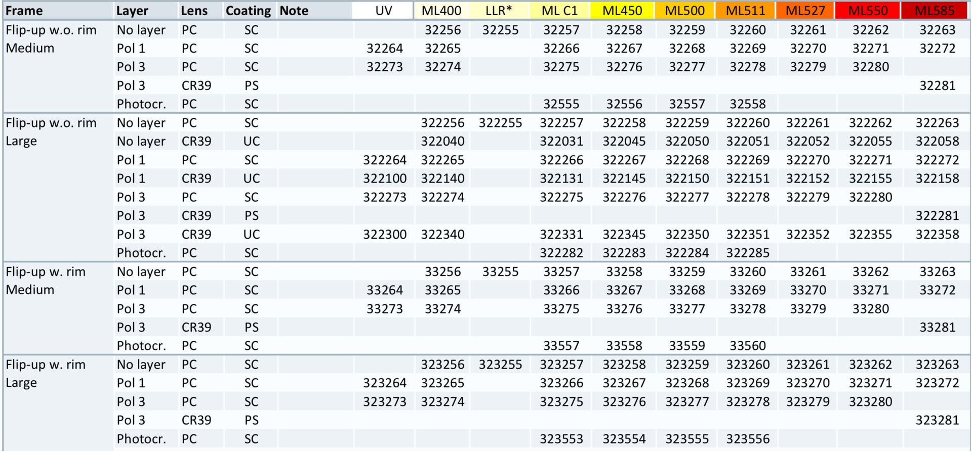Filtres 400, LLR, 450, C1, 500, 511, 527, 550, 585, combiné ou non avec Pol 1, Pol 3, Photochromique :